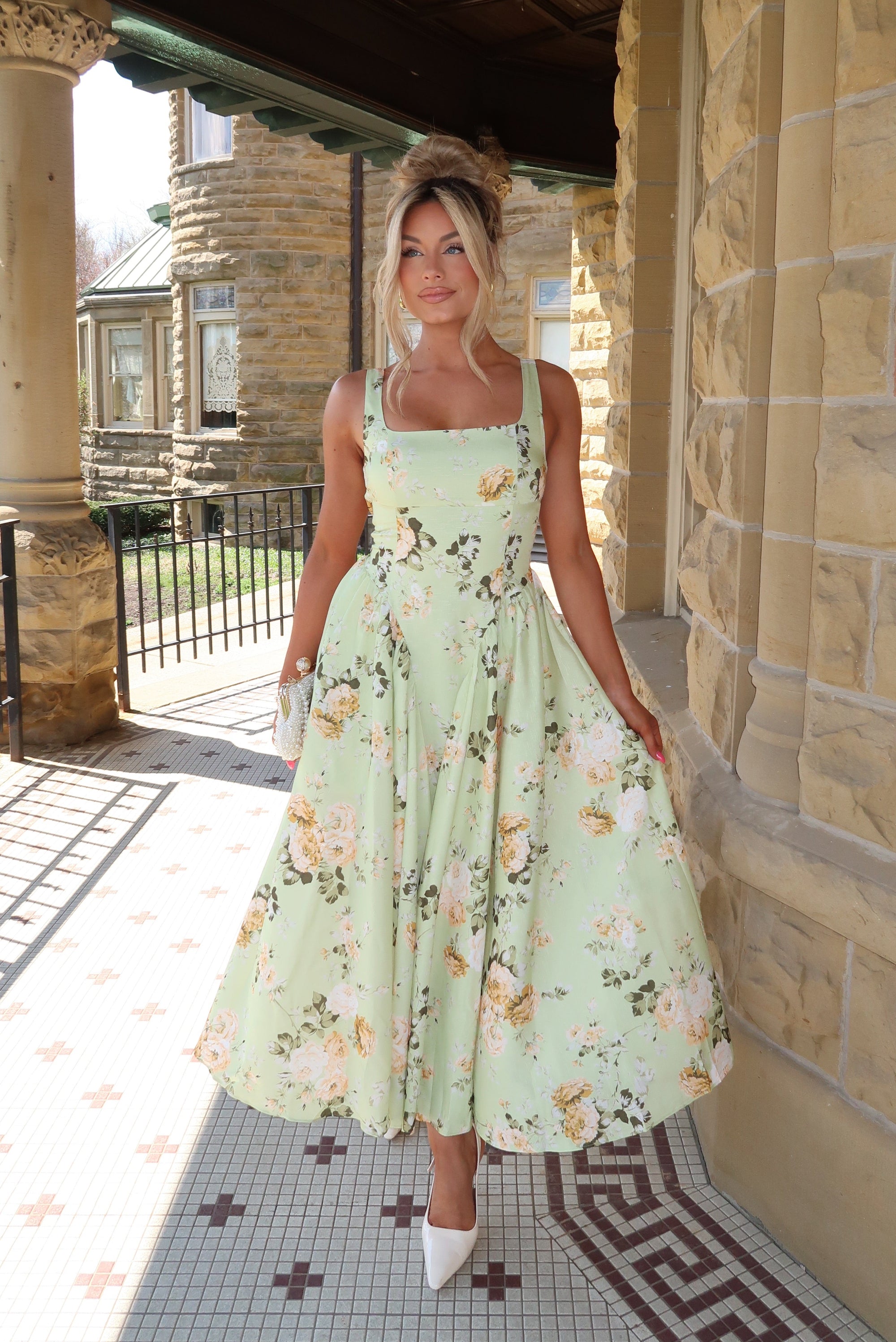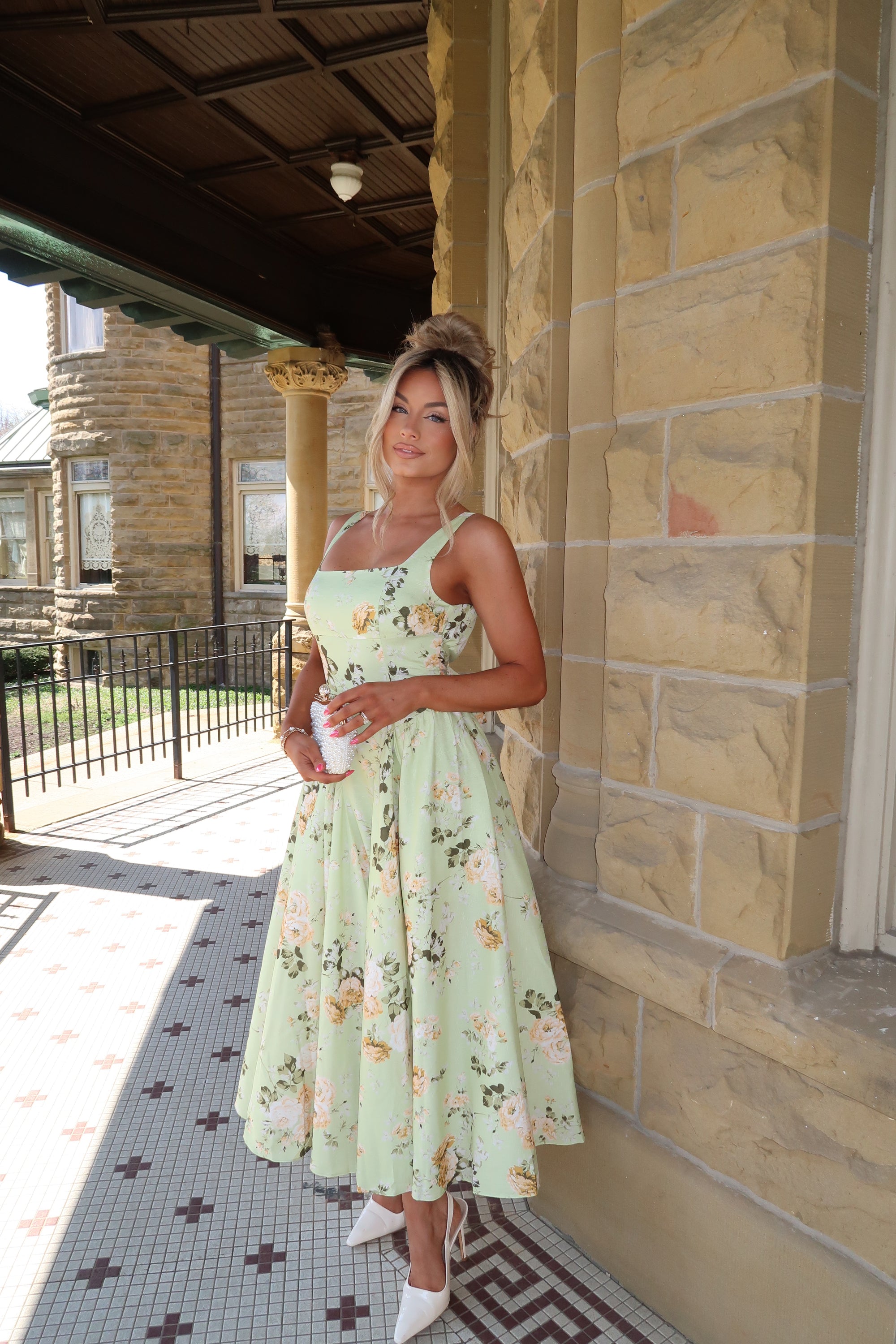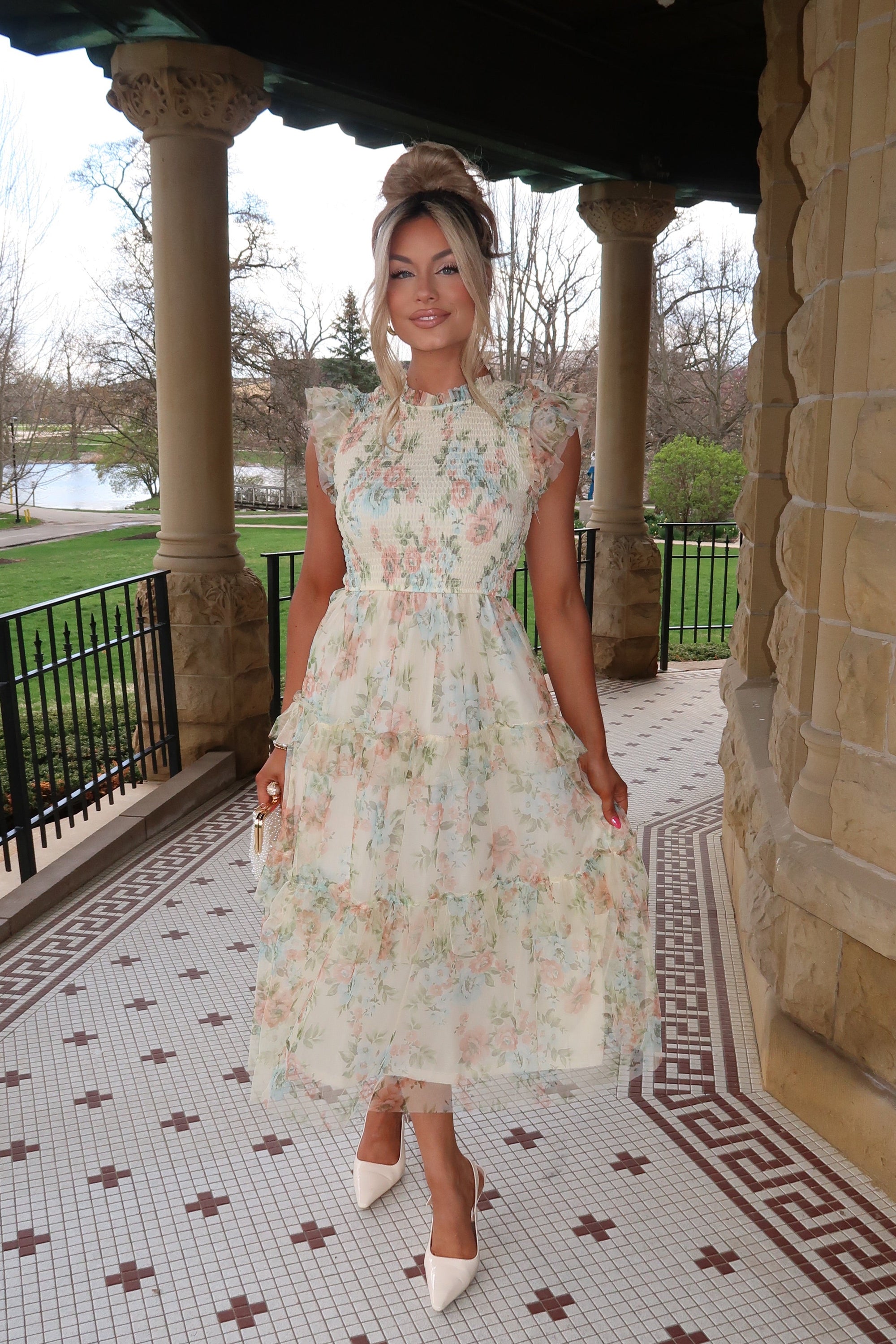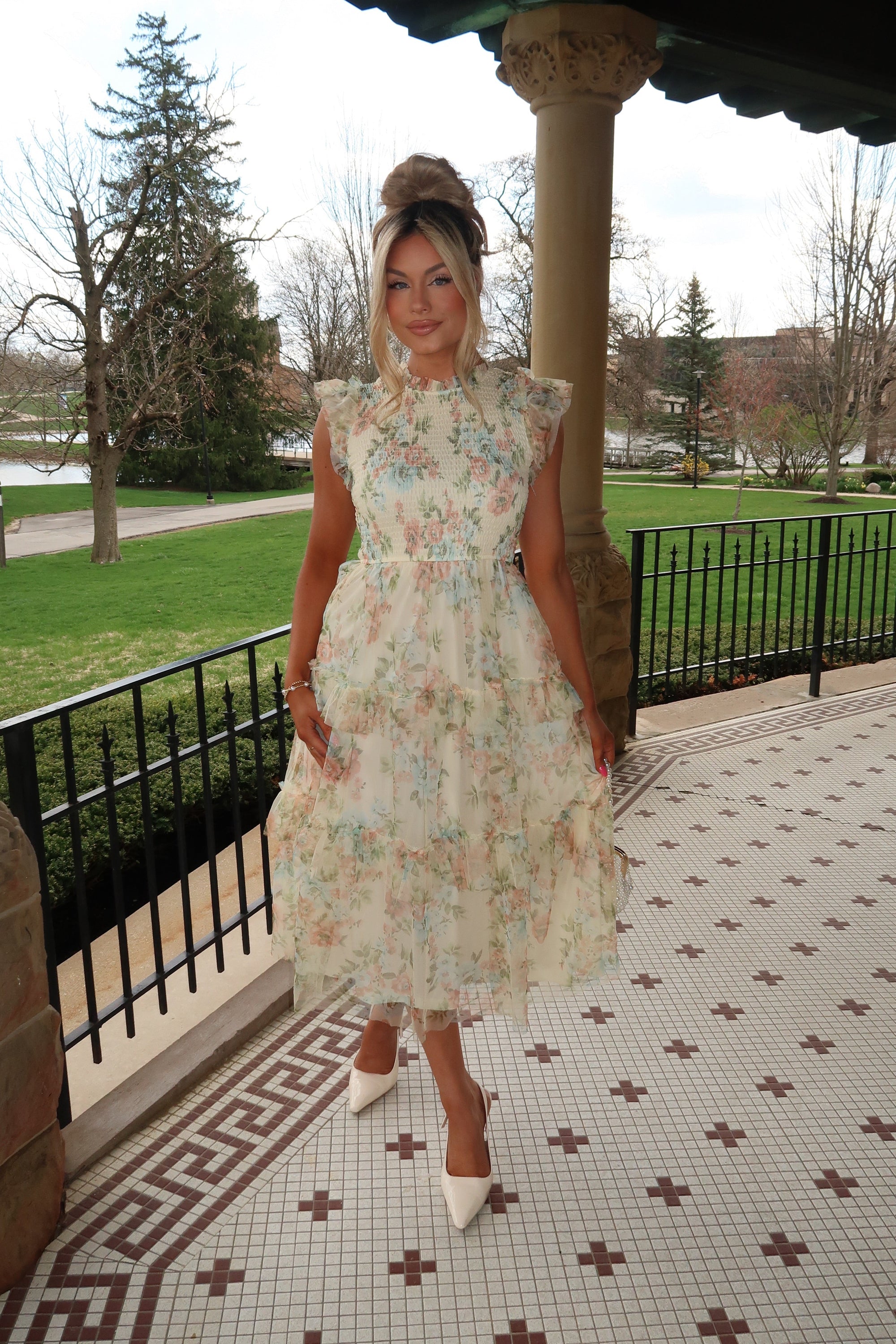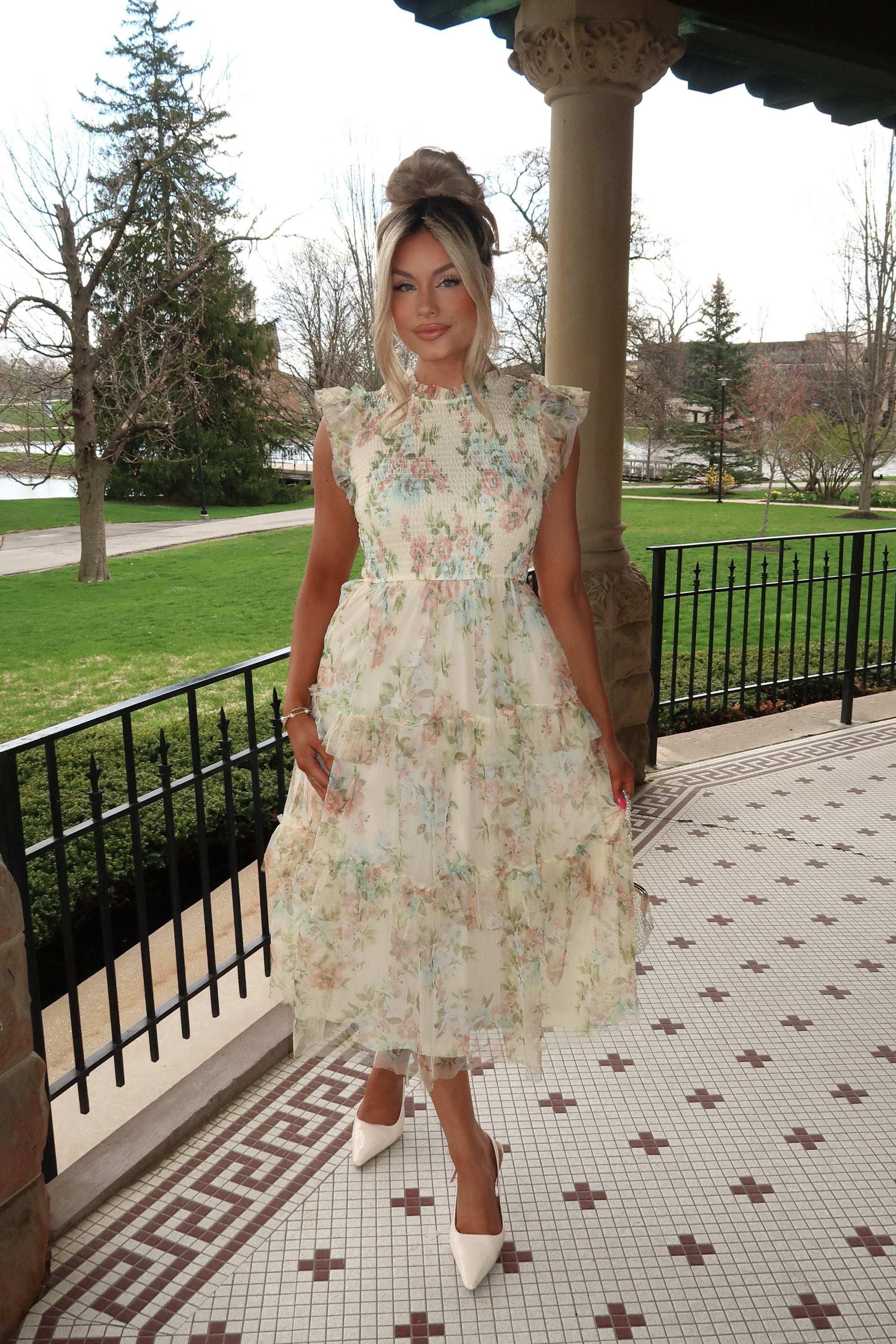 BRIDGERTON FLORAL TULLE MIDI DRESS BUTTER YELLOW