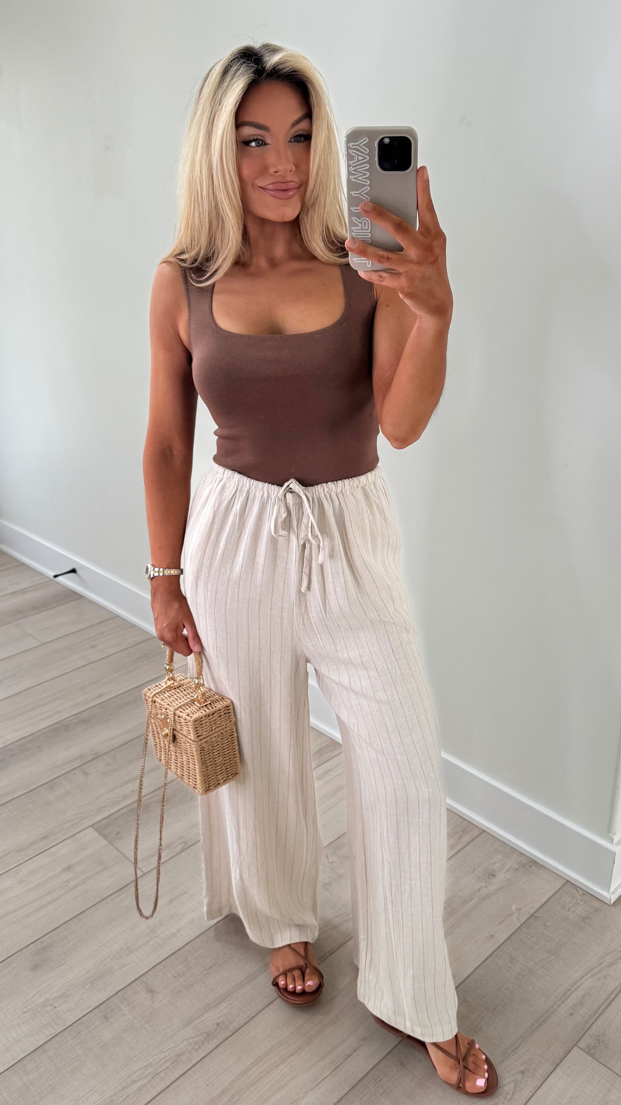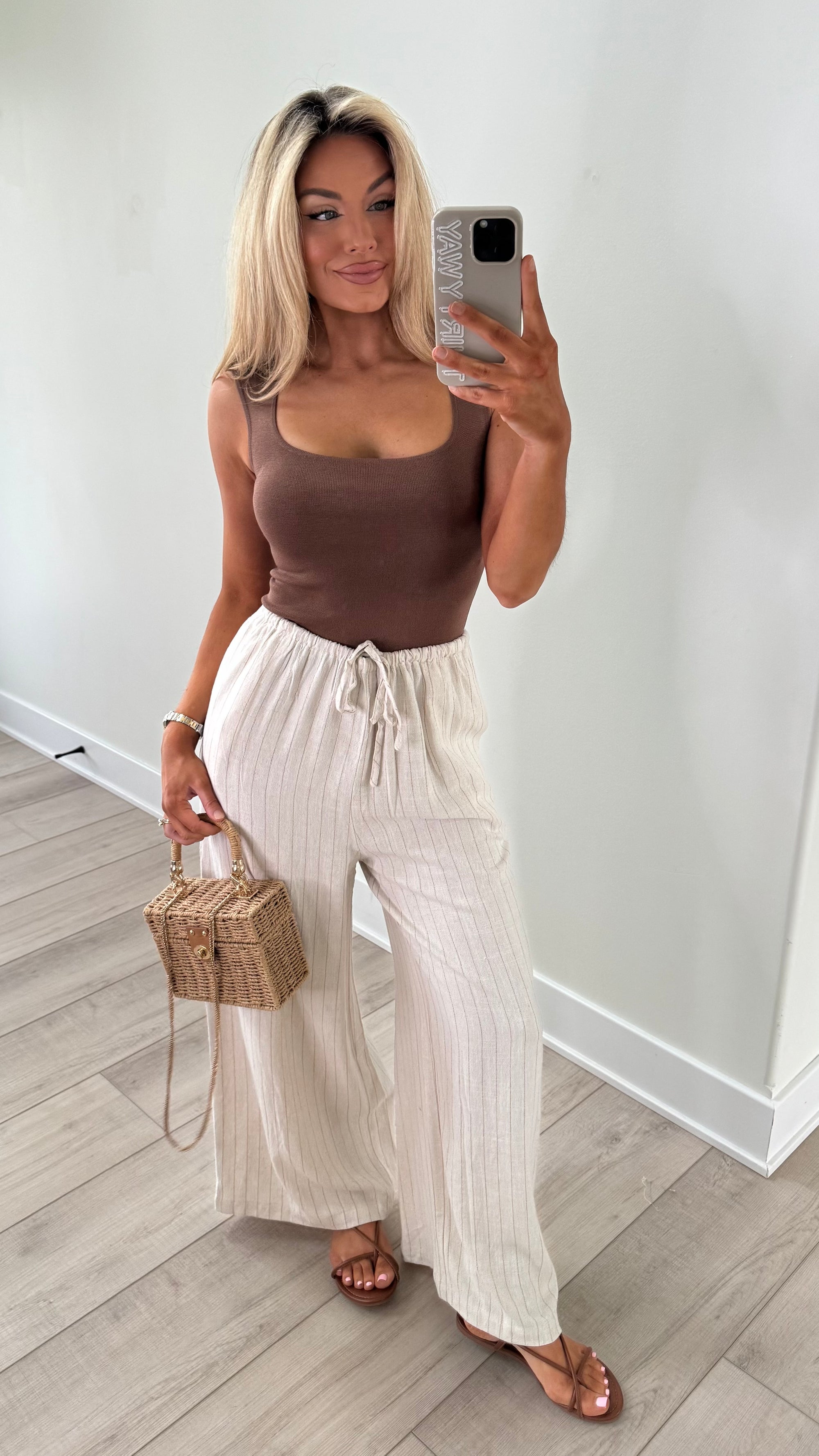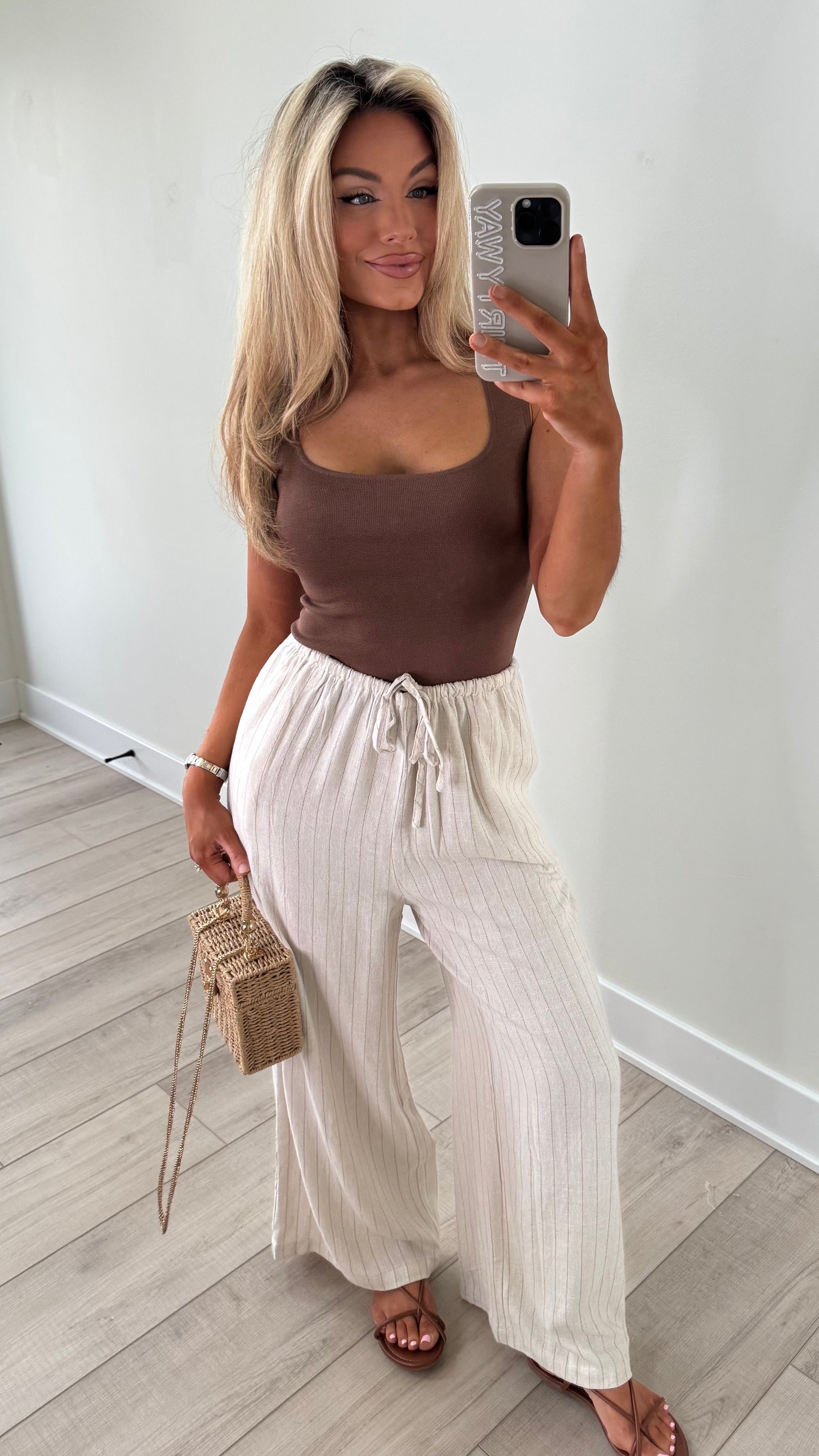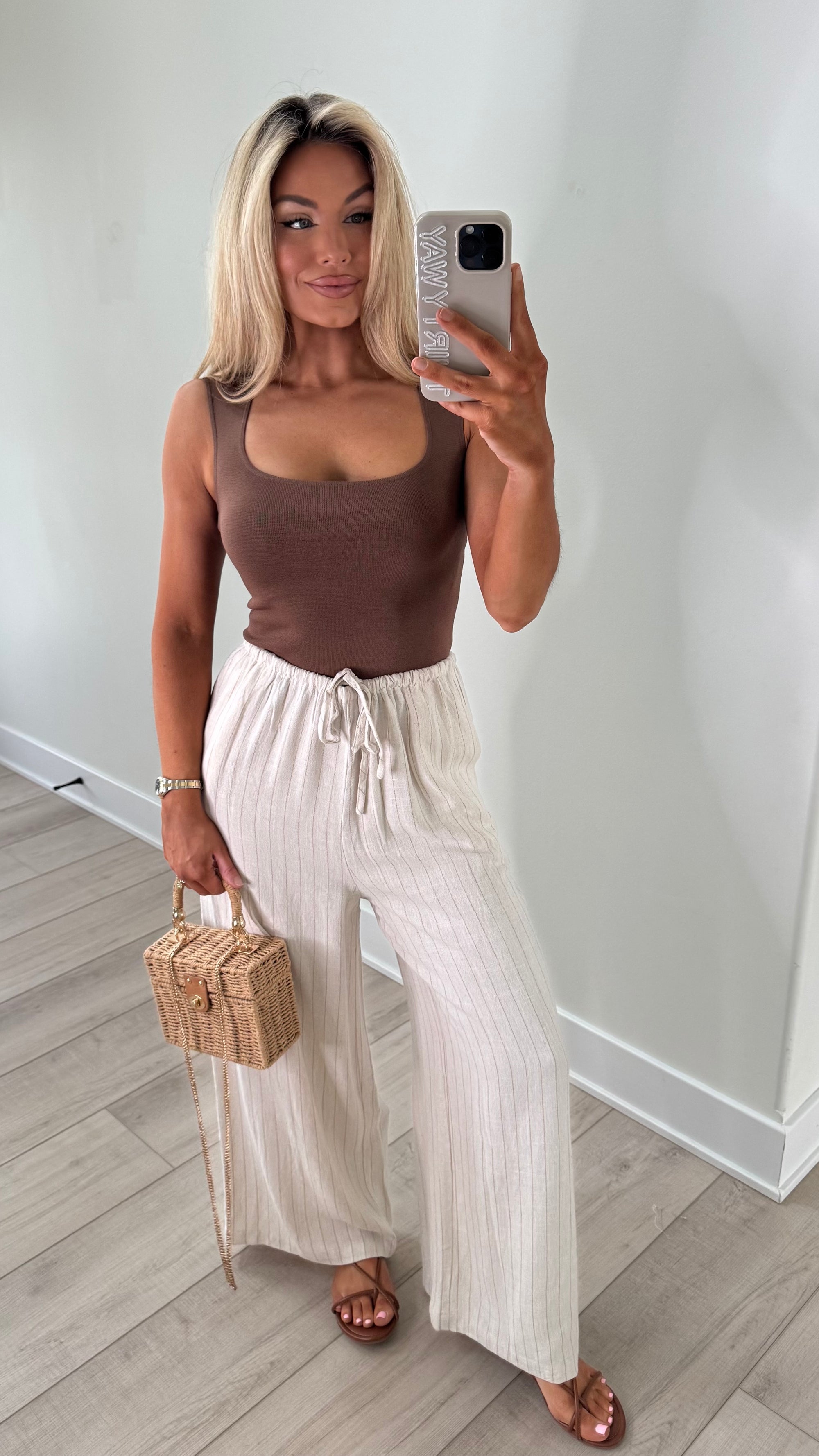 STRIPED WIDE LEG LINEN PANTS OATMEAL