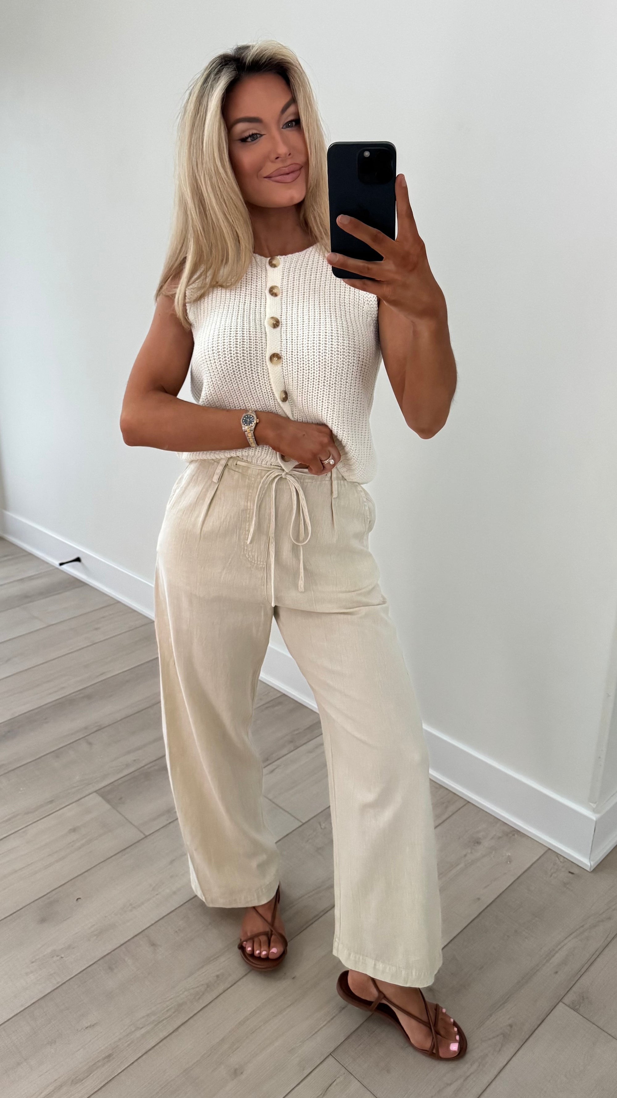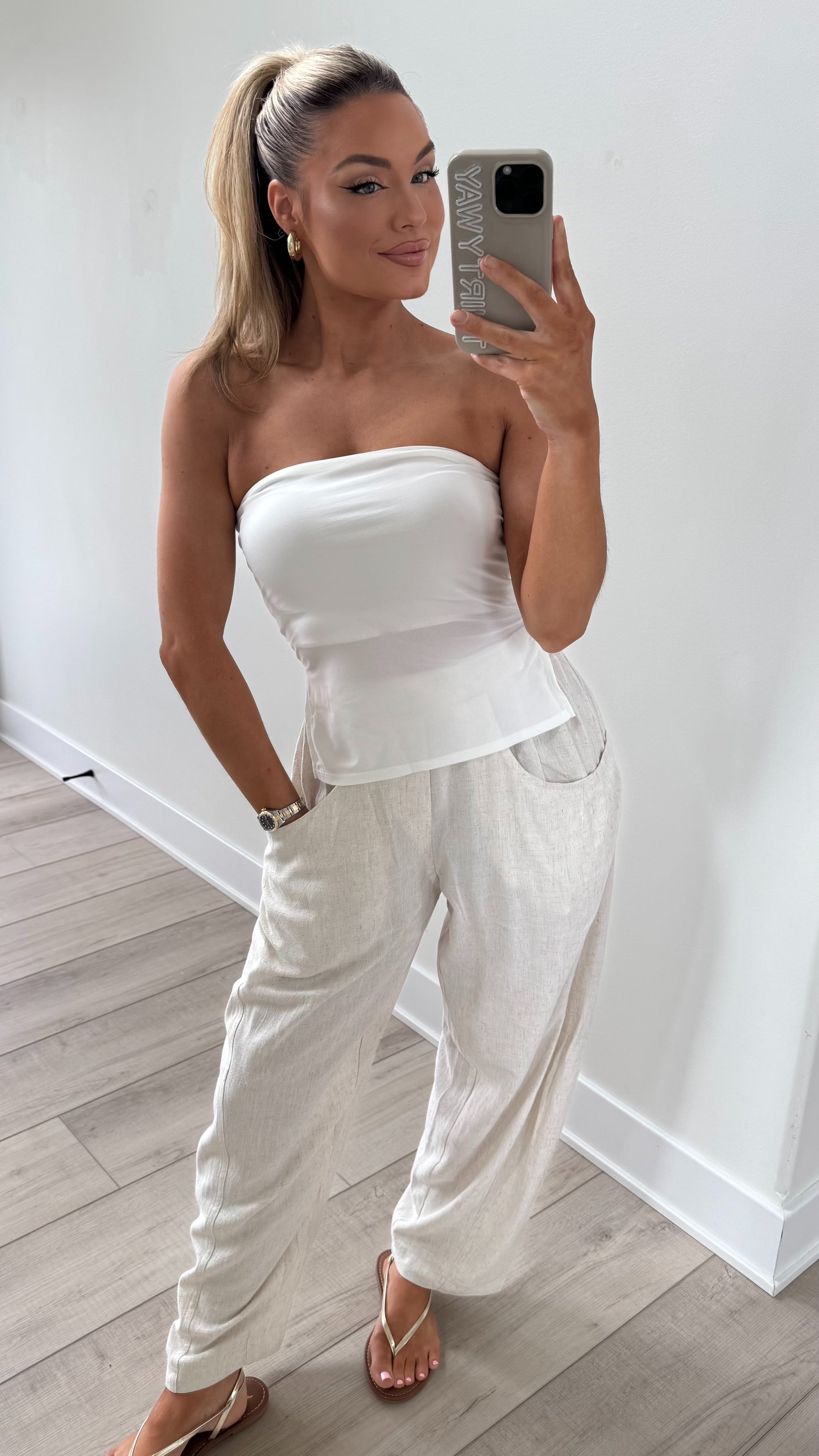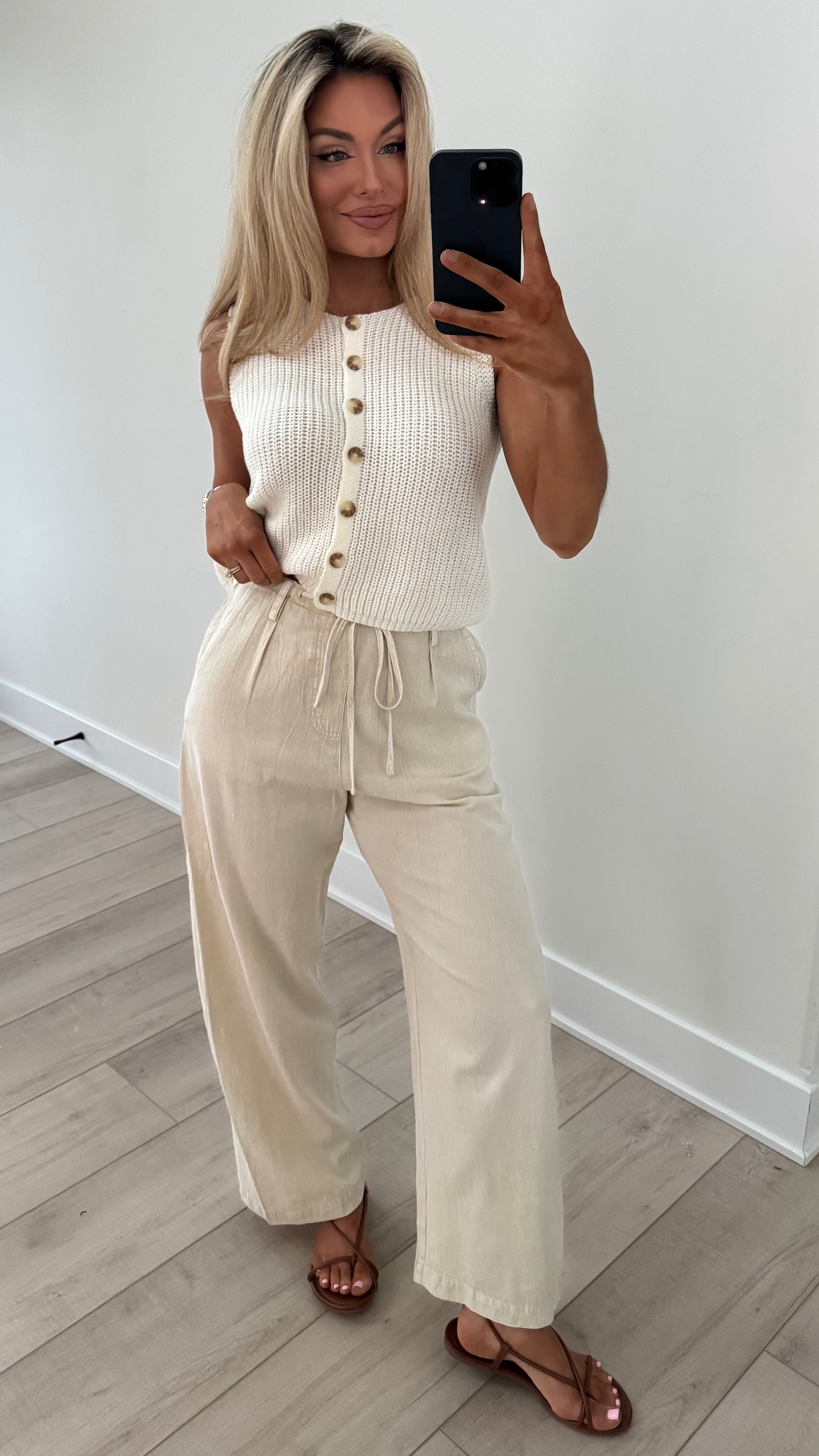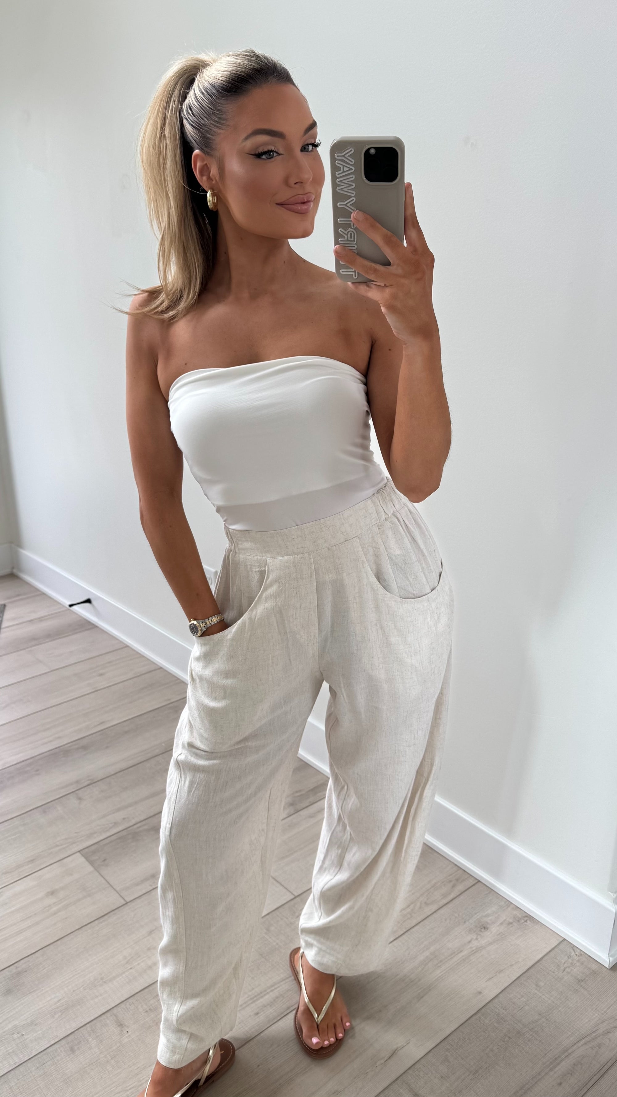 STRIPED WIDE LEG LINEN PANTS OATMEAL