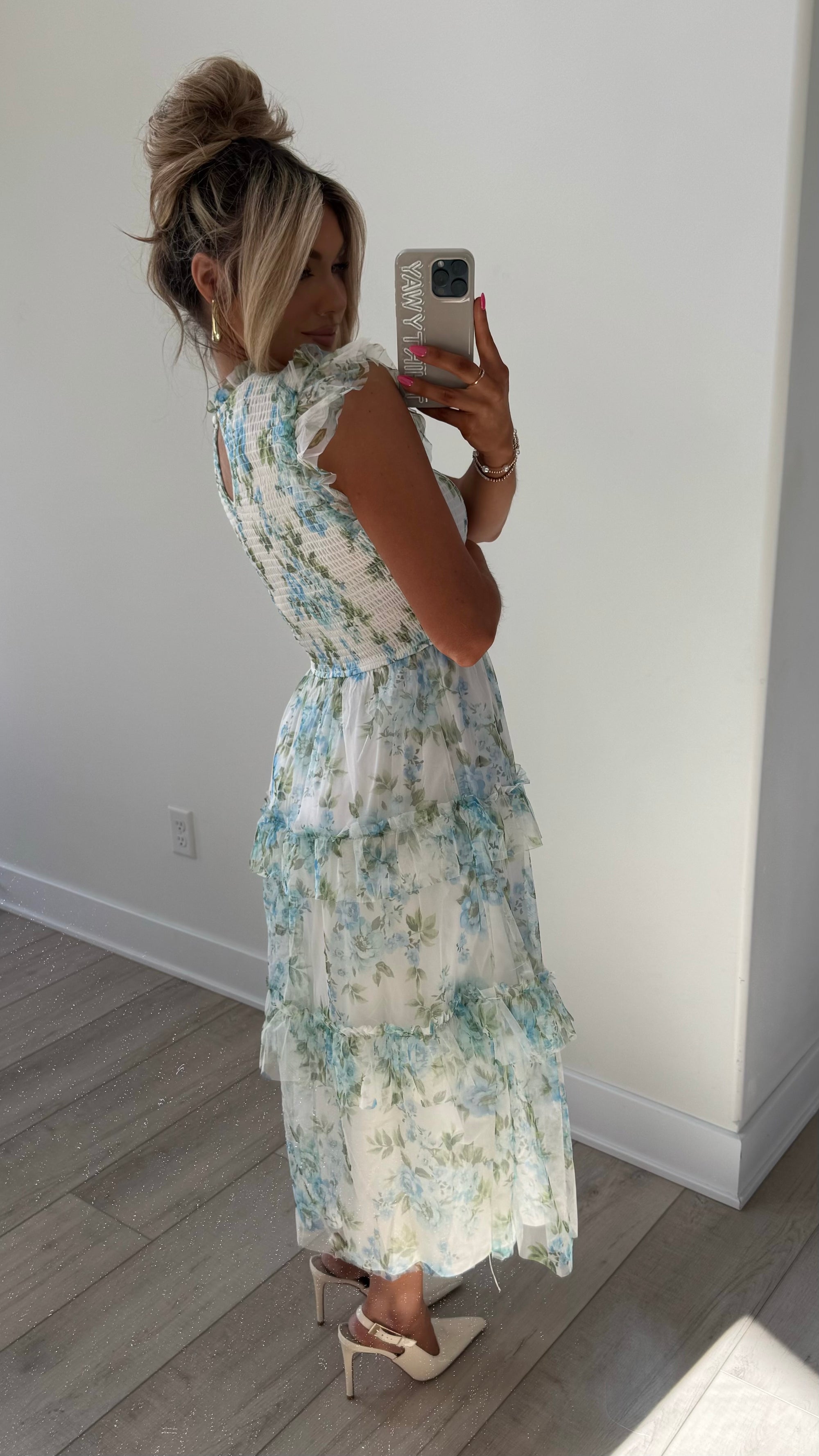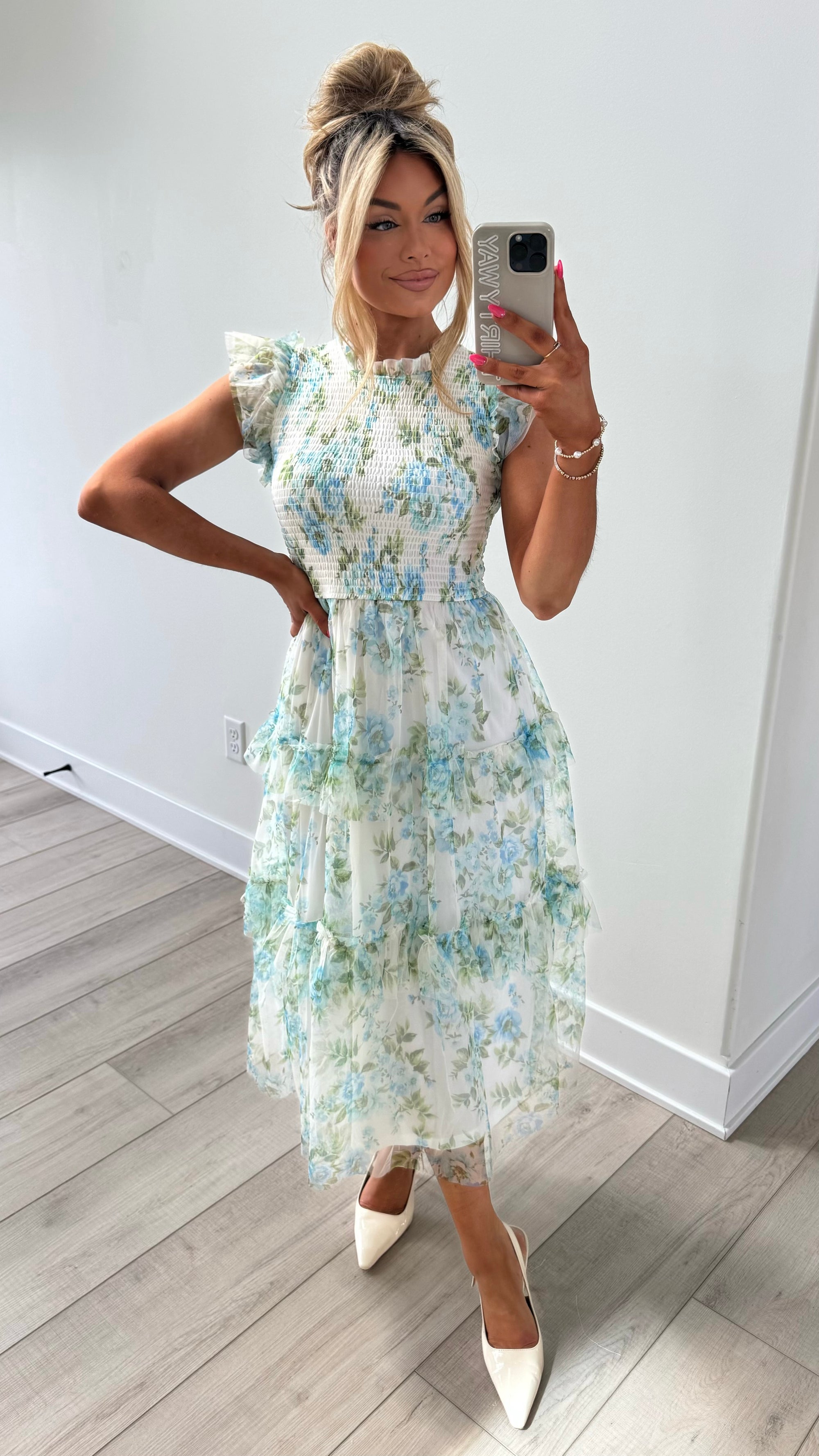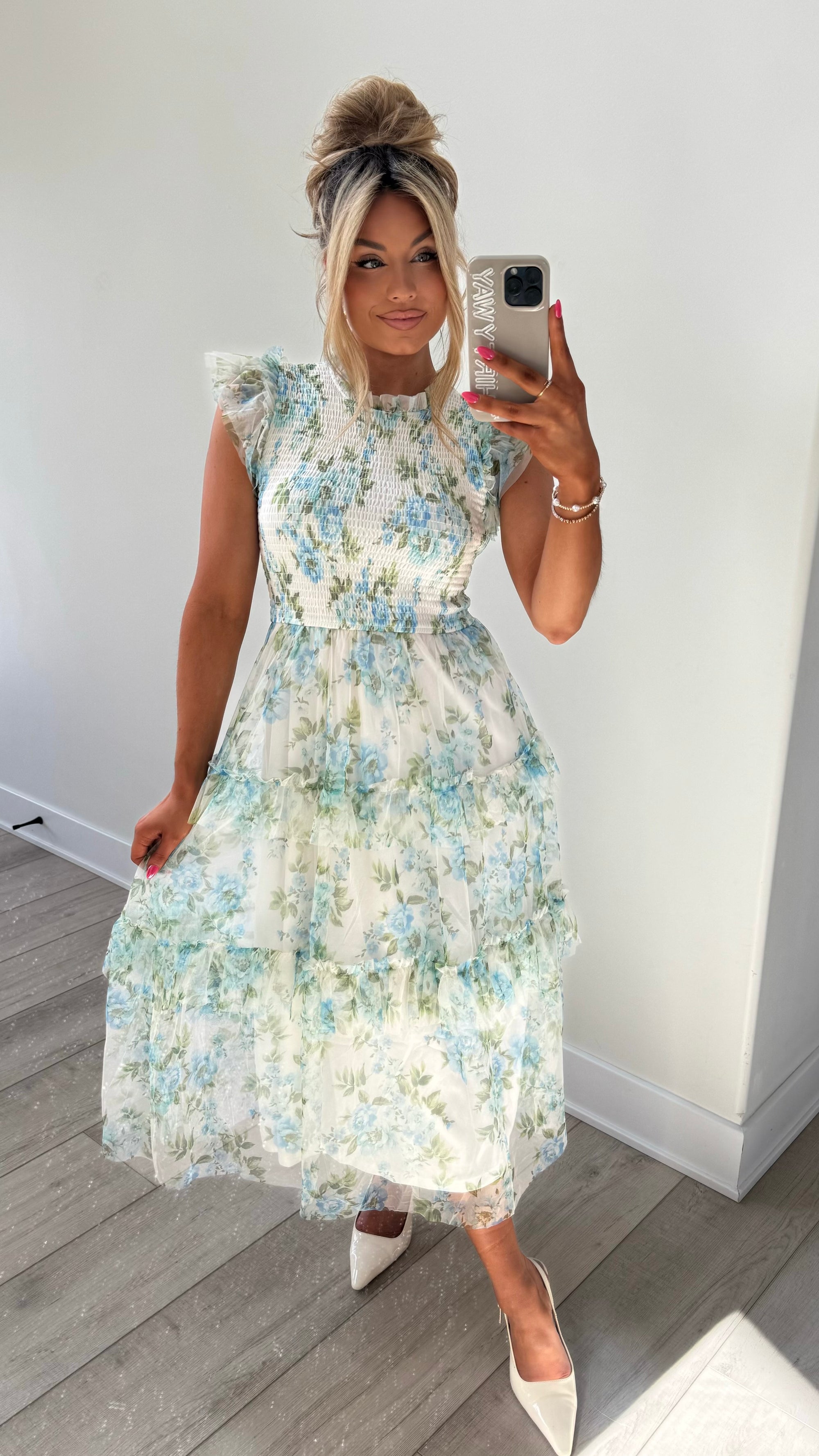 BRIDGERTON FLORAL TULLE MIDI DRESS BLUE FLORAL