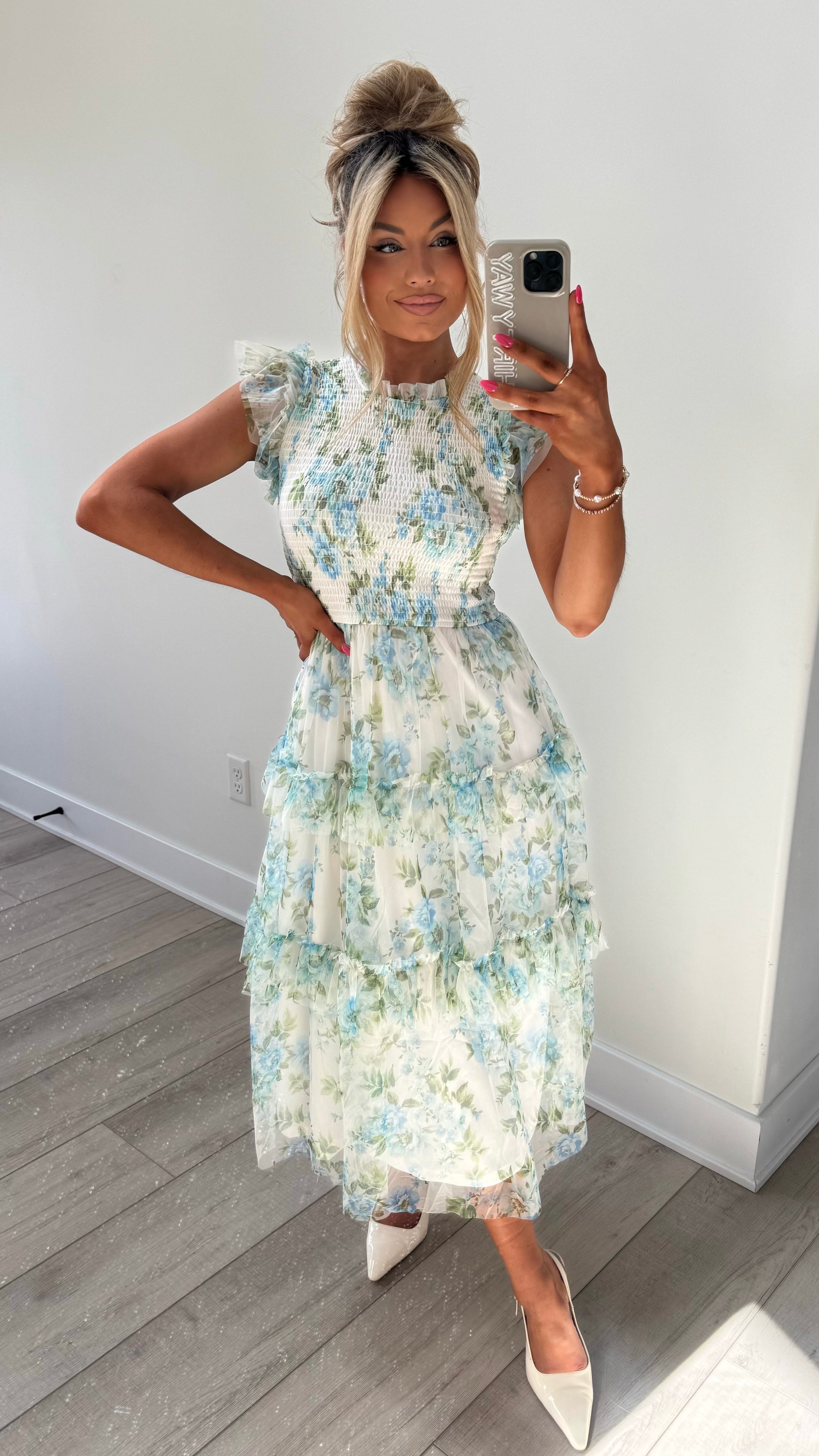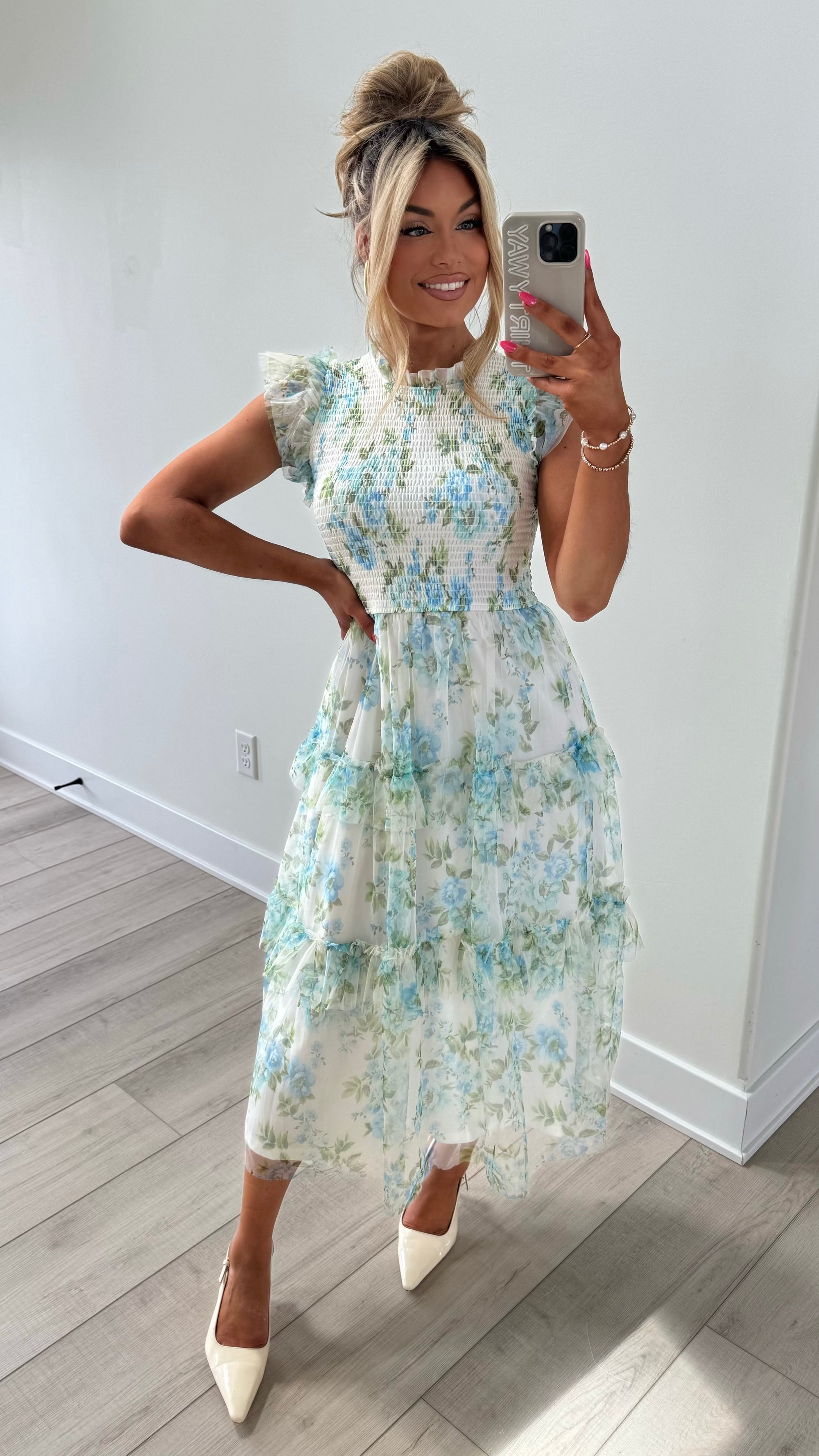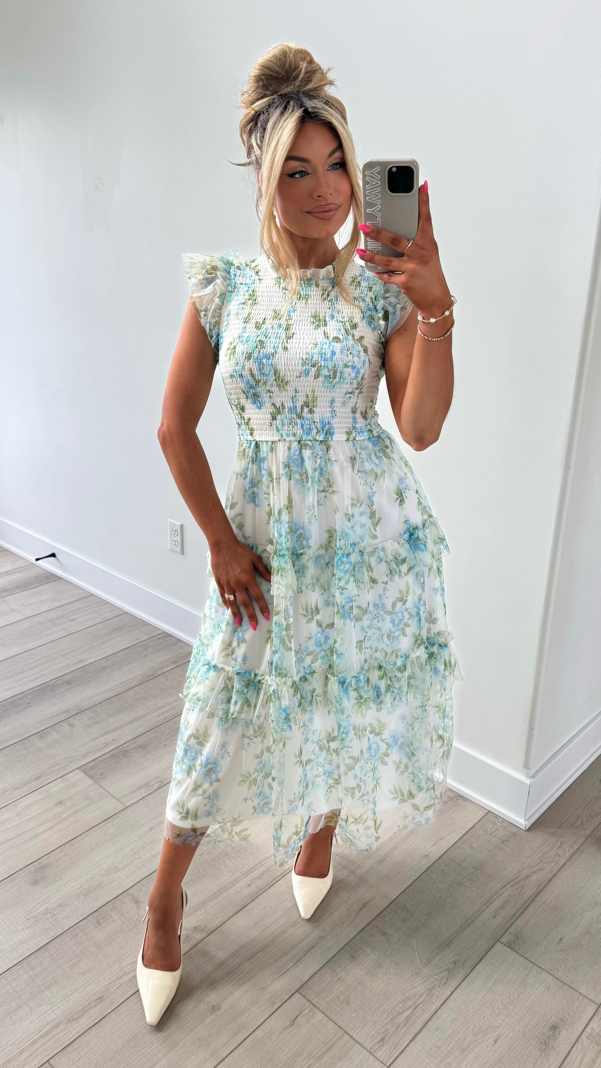 BRIDGERTON FLORAL TULLE MIDI DRESS BLUE FLORAL