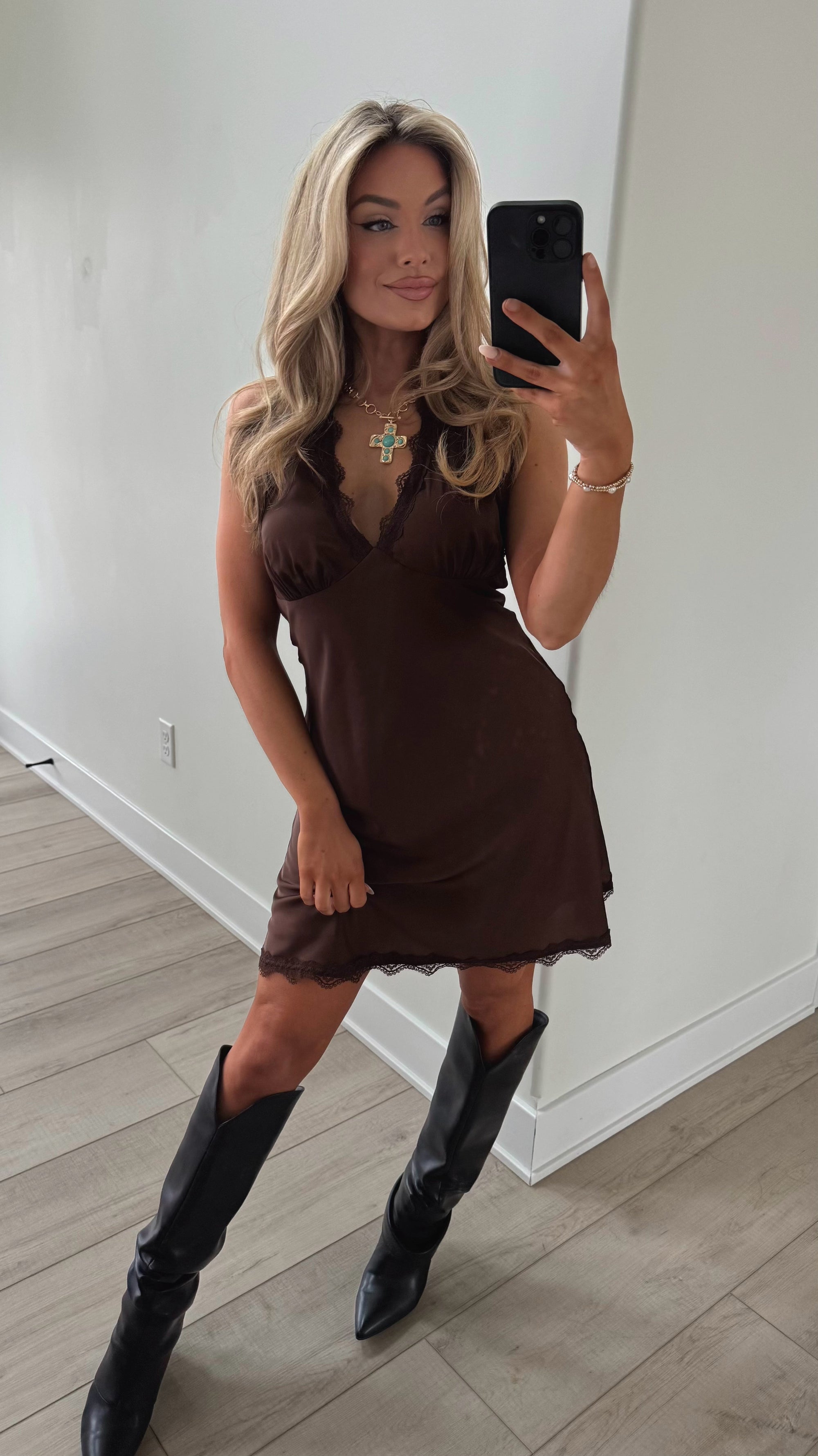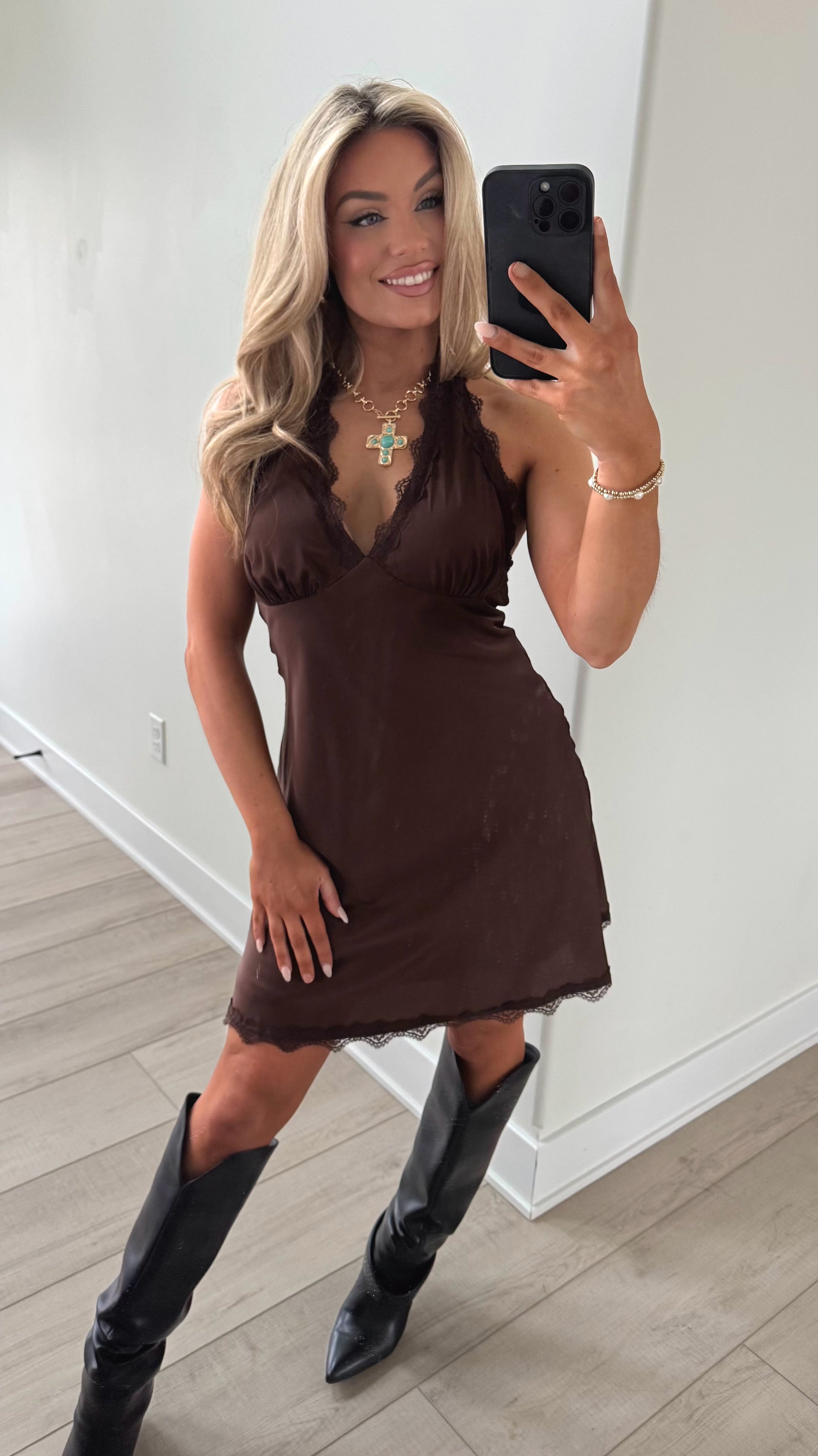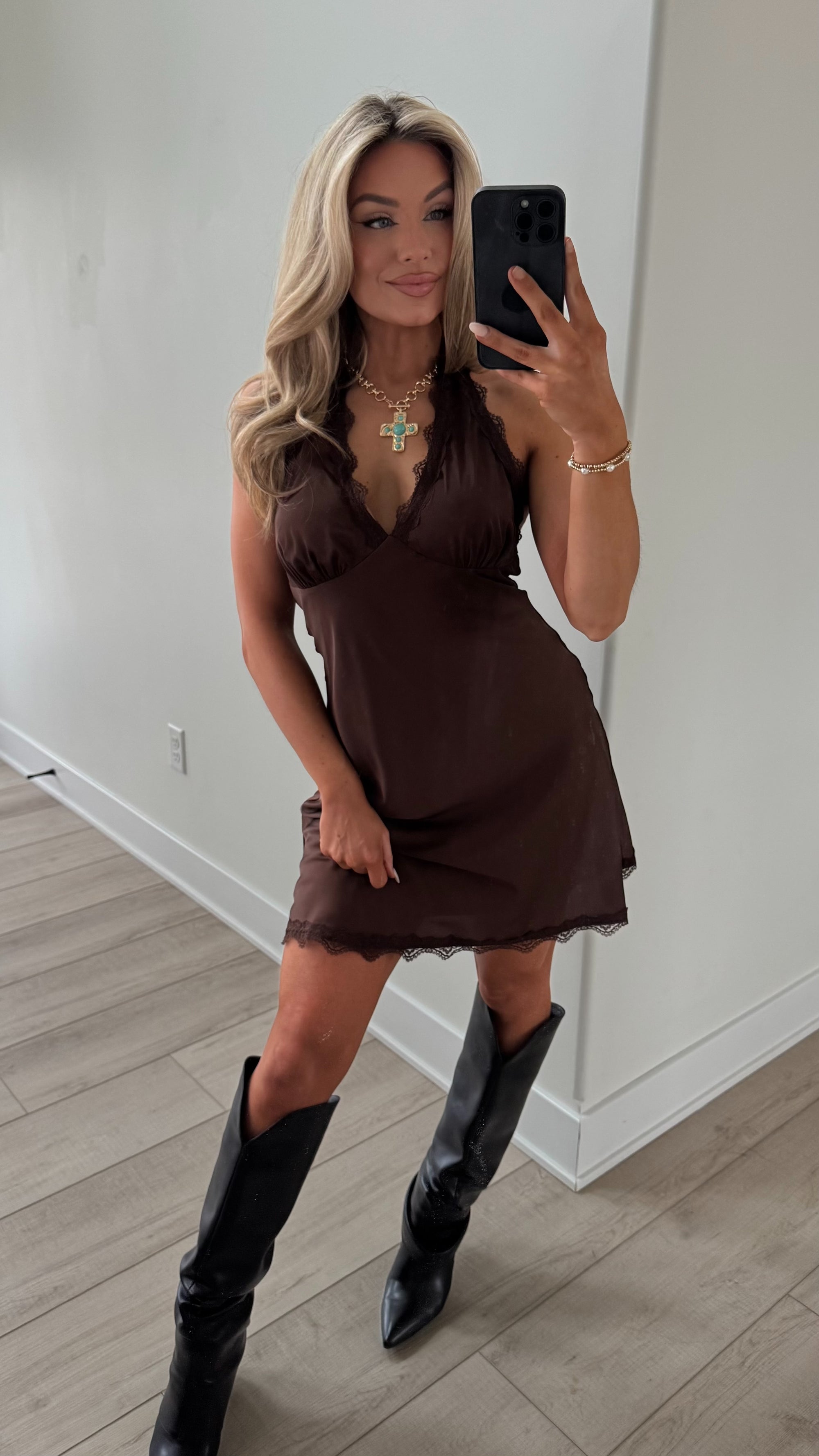 SCOTTSDALE LACE HALTER DRESS CHOCOLATE