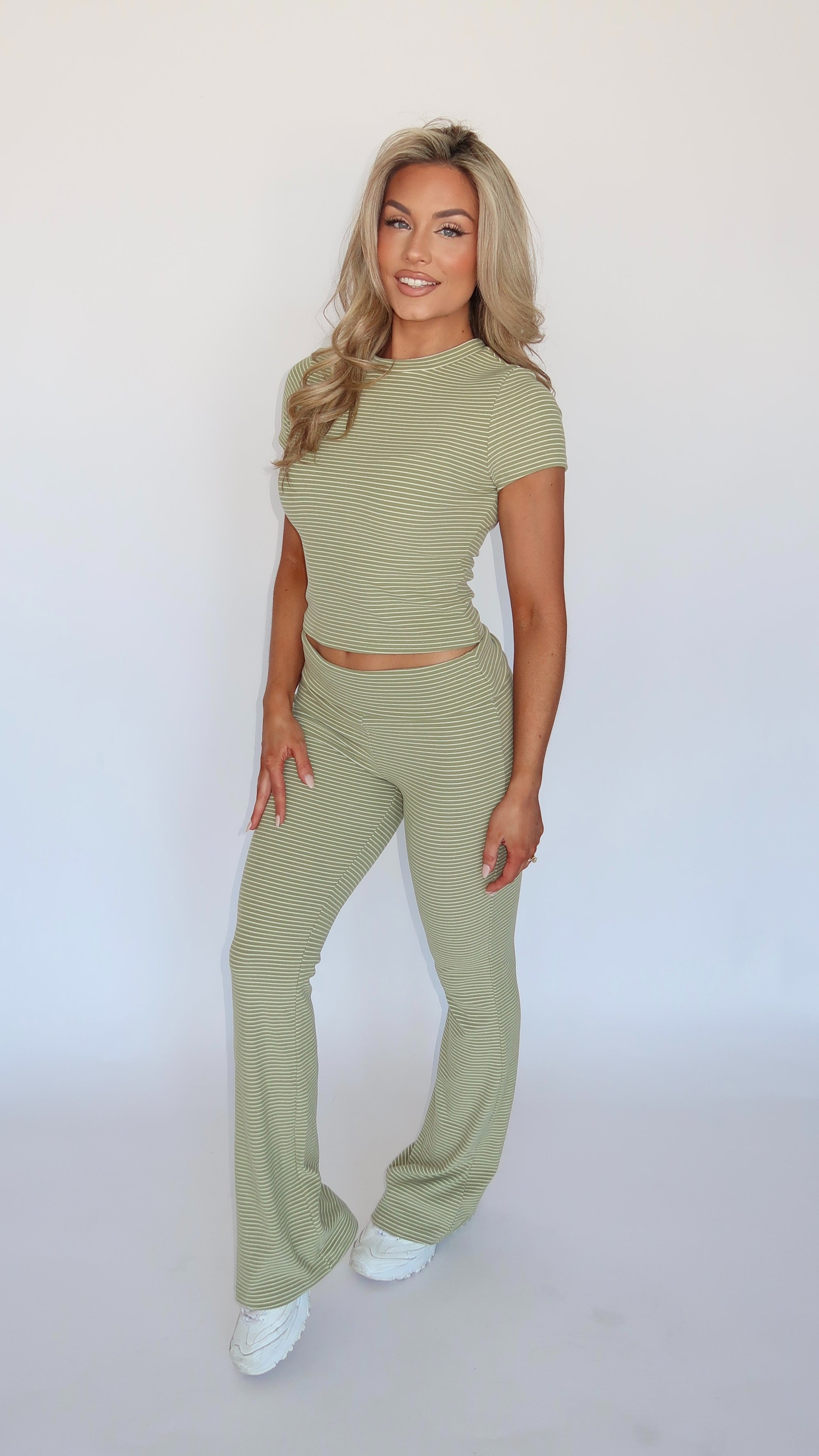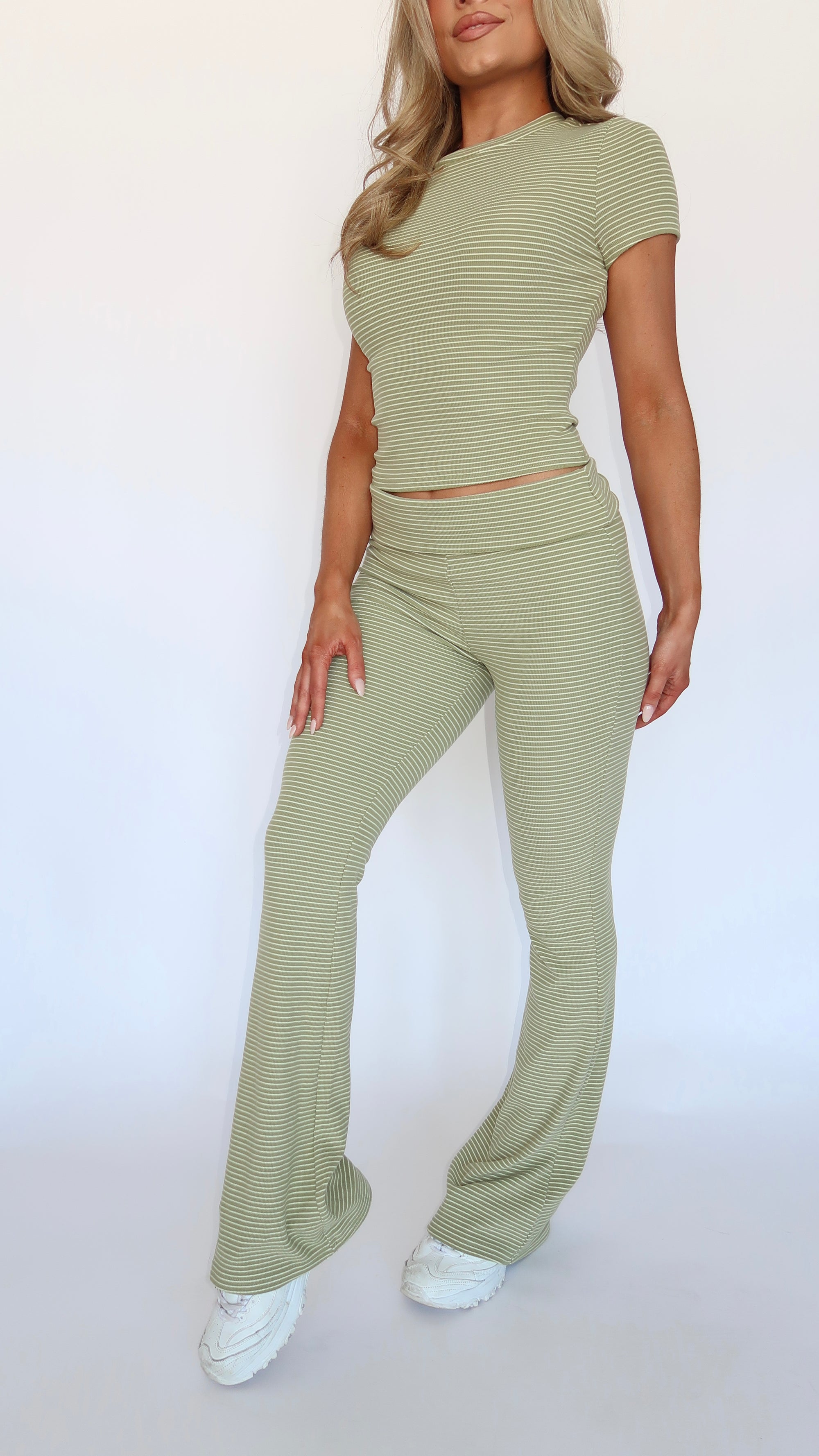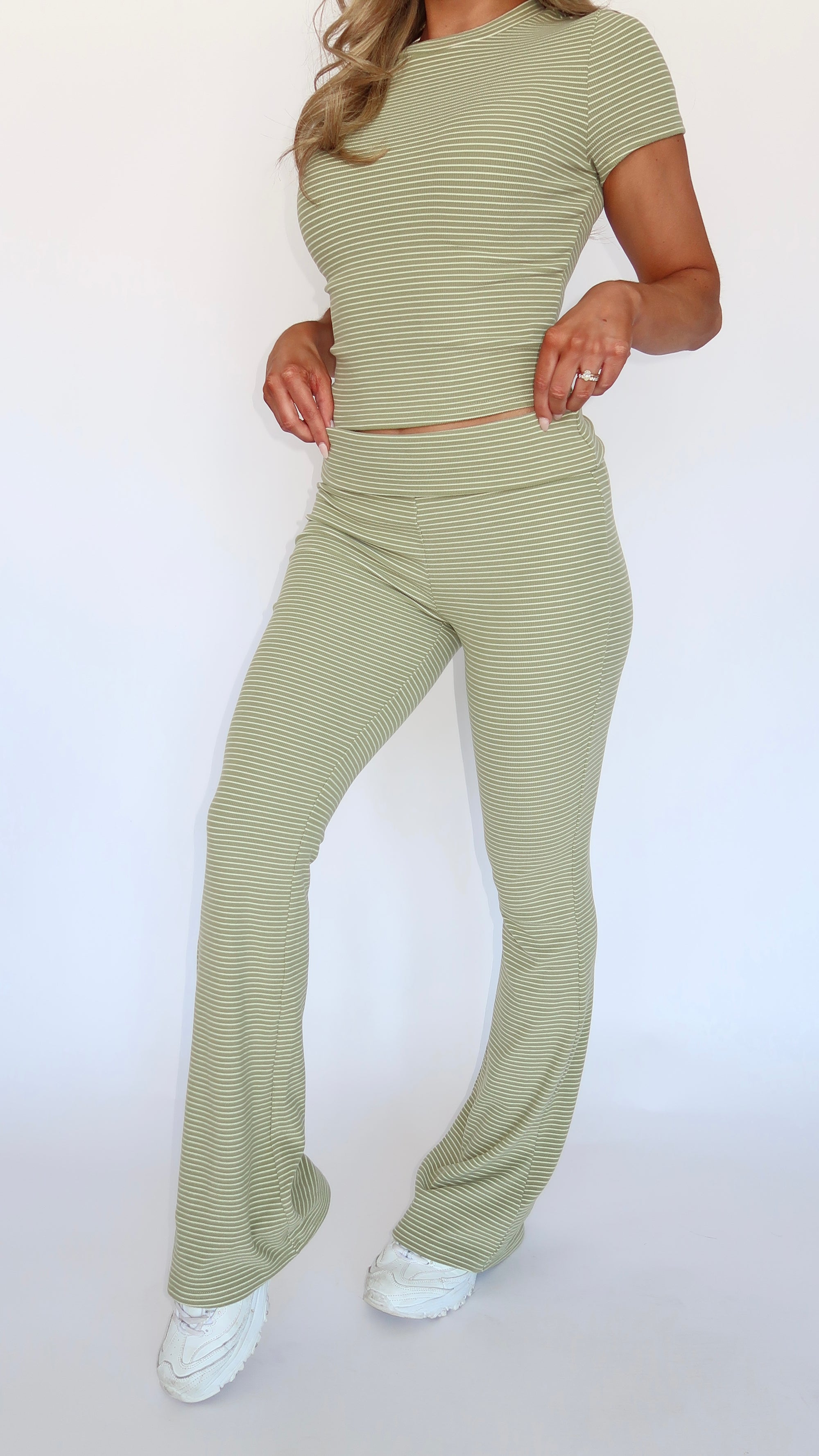 MATCHA GREEN STRIPED FLARE PANTS