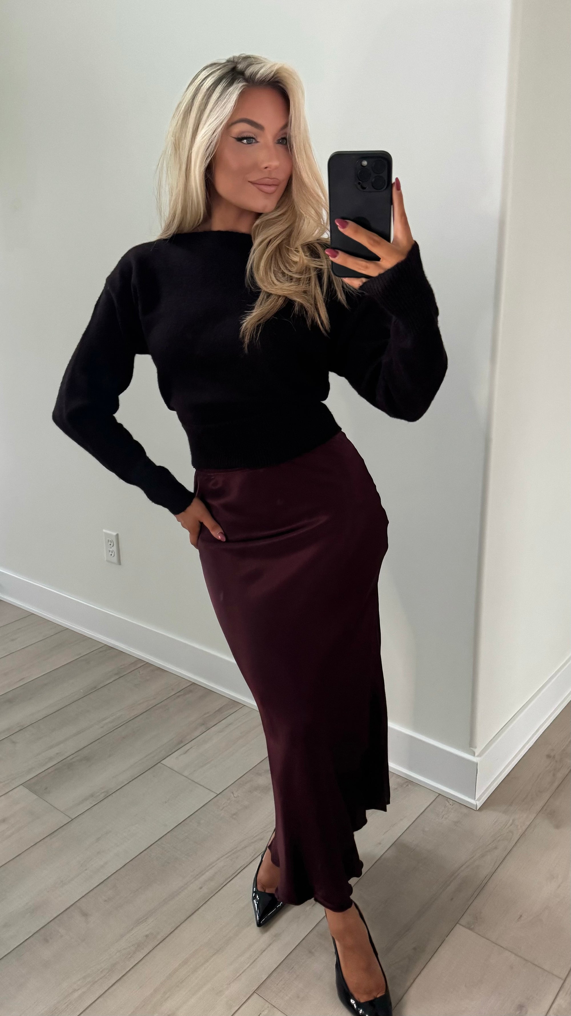 MISTLETOE HIGH-WAISTED MAXI SKIRT WINE